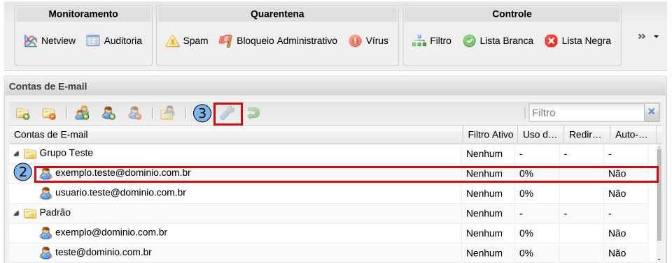 Selecione a conta que deseja alterar (2). Na guia “Contas de E-mail” clique no ícone “Alterar Senha” (3).