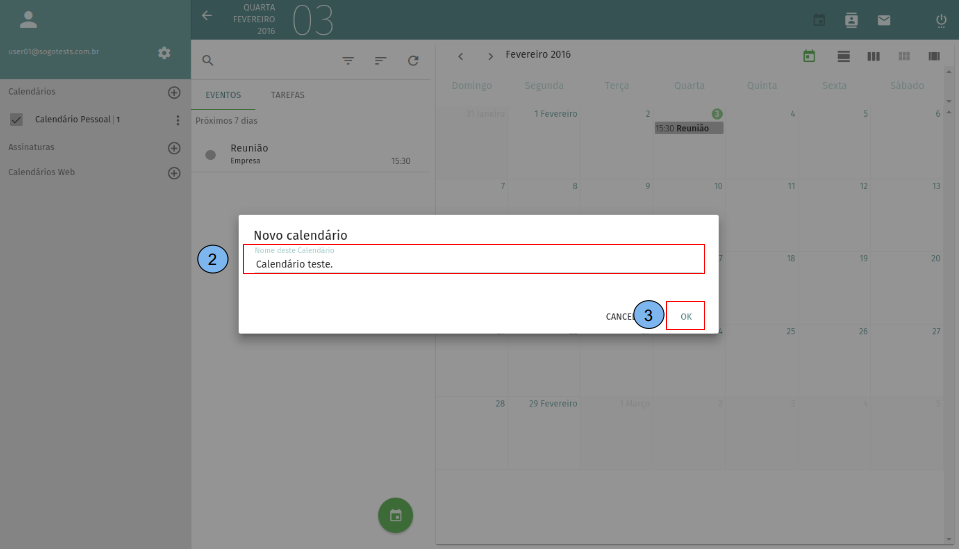 (2)De um nome para o calendário. (3)Para concluir clique em “OK”.