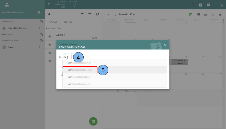 (4) Você pode começar a digitar o endereço de e-mail com quem o calendário será compartilhado. (5) Selecione na listagem o e-mail com quem o calendário será compartilhado.