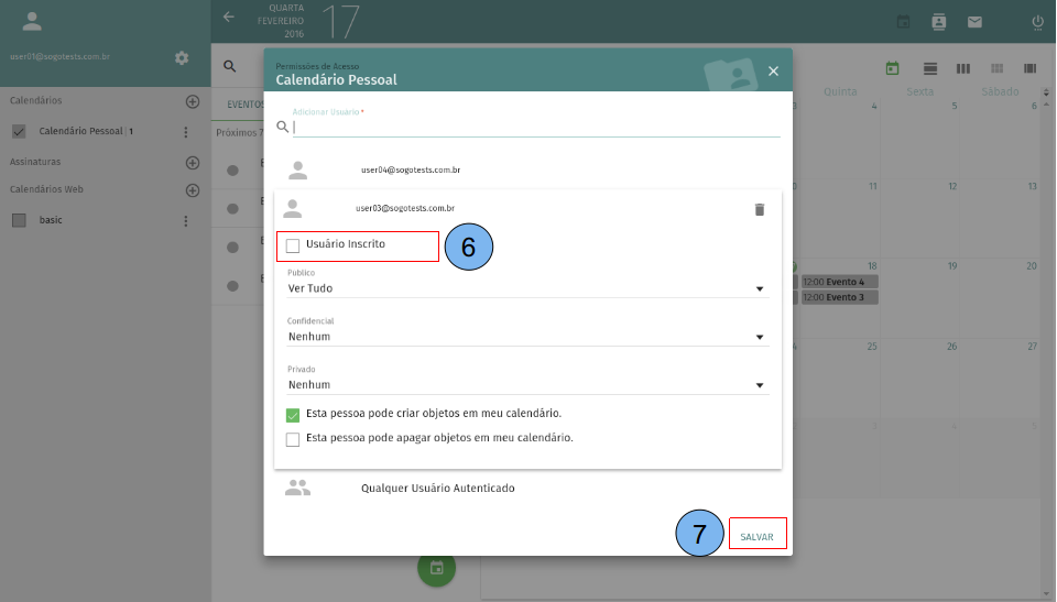 (5) Marque a opção “Usuário inscrito”. (6) Defina as permissões que esse usuário terá sobre o seu calendário. (7) Clique em “Salvar”.
