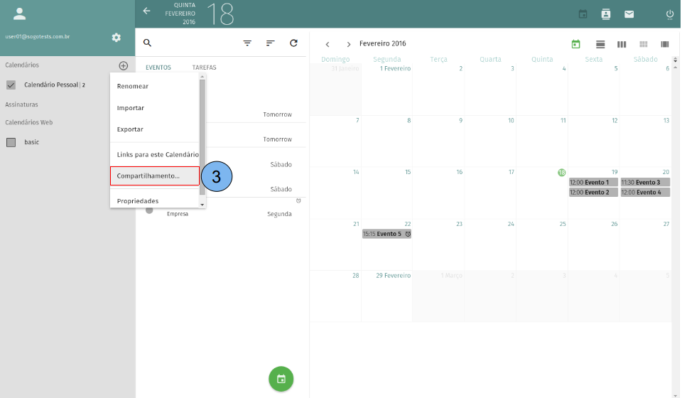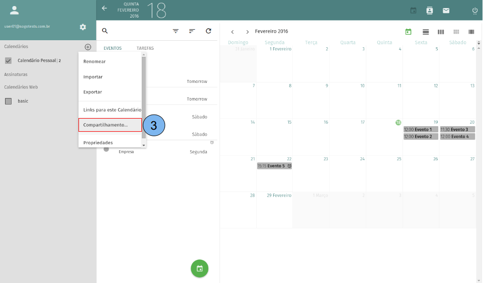 São as permissões especificas de acesso ao seu calendário que cada usuário do domínio terá. (1)Acesse Calendário. (2)Em seguida acesse o menu do calendário.