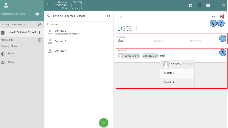 (4) De um nome para a lista. *Na lista de contatos somente é possível cadastrar usuários que já pertençam ao seu catálogo de contatos. (5) Em “Membros” insira os contatos que farão parte da lista. (6)Caso seja necessário é possível desfazer tudo que foi digitado. (7)Se os dados estiverem corretos clique no botão “Salvar”.