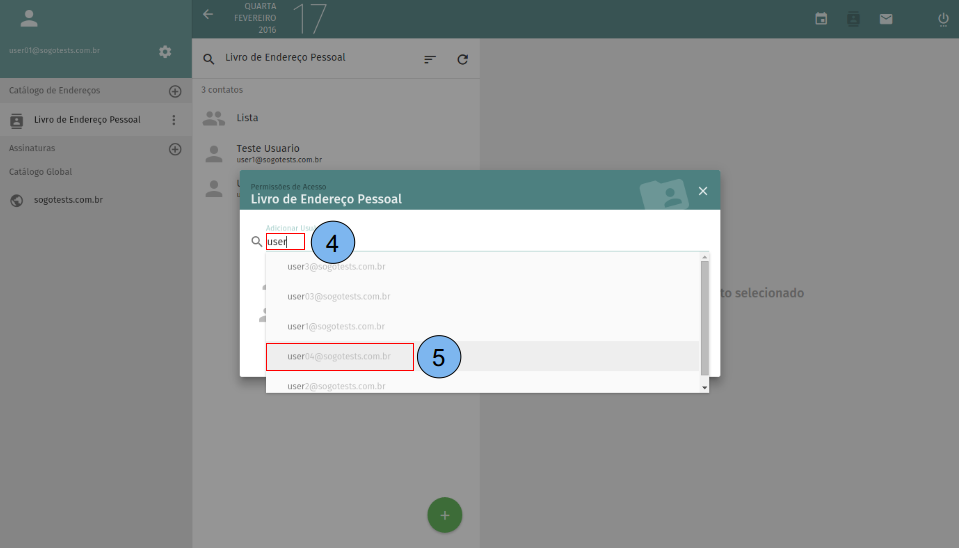 (4) Você pode começar a digitar o endereço de e-mail com quem o catálogo será compartilhado. (5) Selecione na listagem o e-mail com quem o catálogo será compartilhado.
