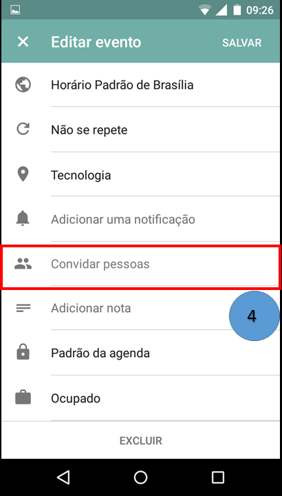 Na próxima tela selecione o calendário onde o novo evento será criado e preencha as informações do mesmo (3), depois clique em “Salvar” (4).