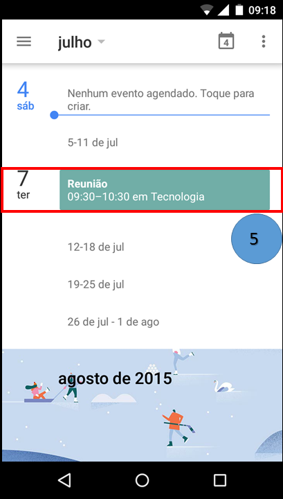 As telas abaixo mostram como criar eventos em dispositivos Android. Abra o aplicativo “Agenda” em seu dispositivo (1).