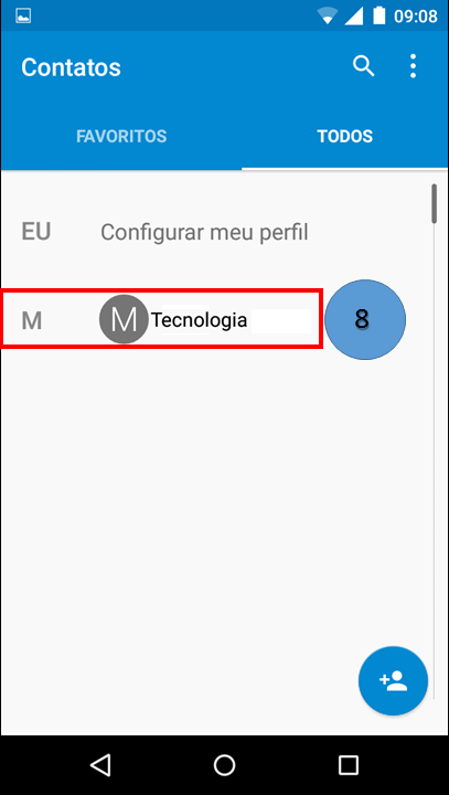 Na tela principal de contato será apresentado o contato recém criado (8).