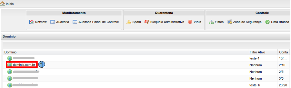 Para iniciar o processo de Configuração de Filtro de Segurança em domínio, na tela inicial do Painel de Controle, localize o domínio que será configurado, neste caso, será utilizado “domínio.com.br” (1), clique duas vezes sobre o mesmo.