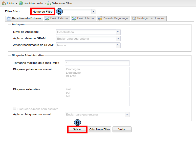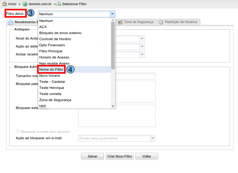 Na opção “Filtro Ativo” (3), localize e selecione o filtro que deseja atribuir para o domínio, neste caso iremos utilizar o filtro “Nome do Filtro” (4).