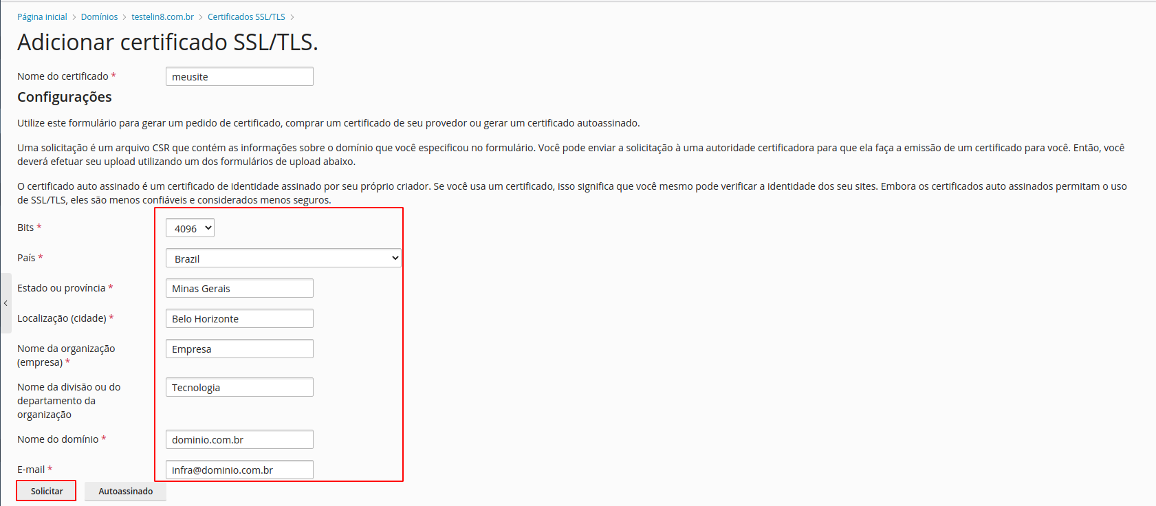 - E-mail:: Defina um e-mail para o certificado, de preferência: infra@dominio.com.br - admin@dominio.com.br - webmaster@@dominio.com.br - sysadmin@dominio.com.br