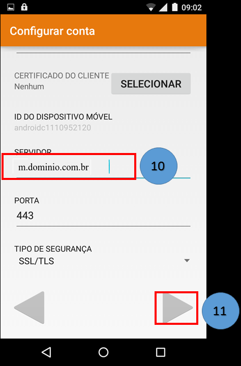 Na próxima tela preencha o nome do servidor “m.dominio.com.br”(10) e clique em “PRÓXIMO”(11).