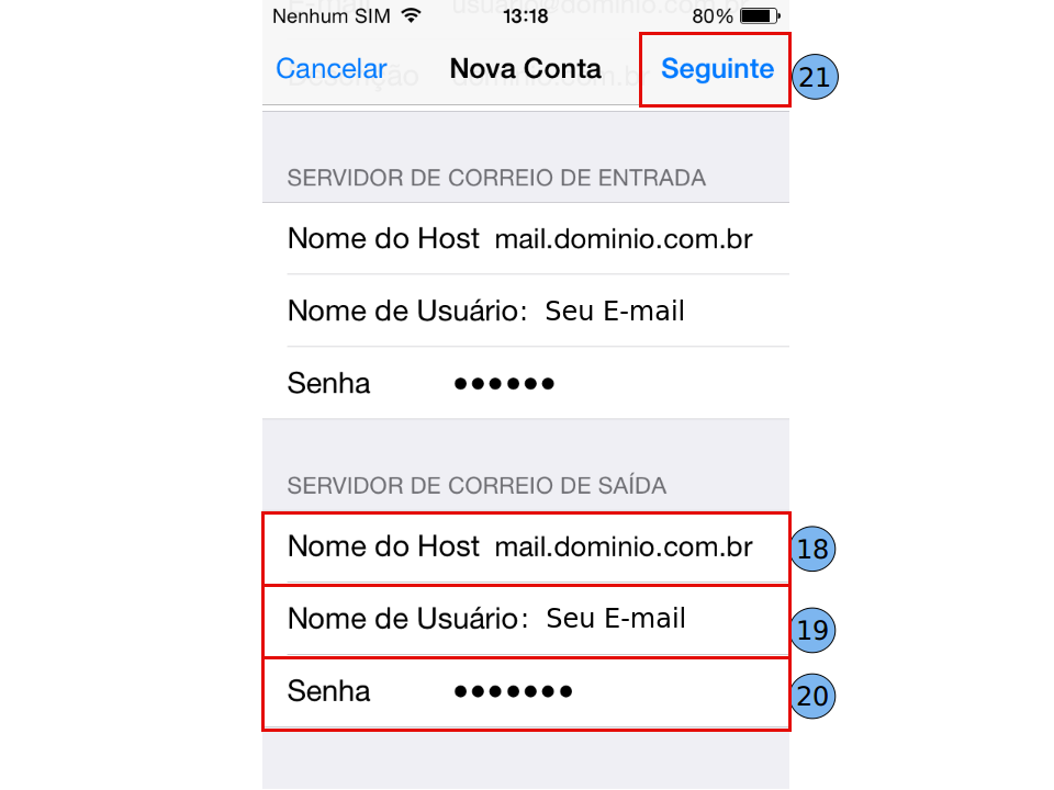 "Servidor de Correio de Saída": Nome do Host (18): mail. dominio.com.br Nome de Usuário (19): digite seu e-mail. Senha (20): digite sua senha. Seguinte (21).