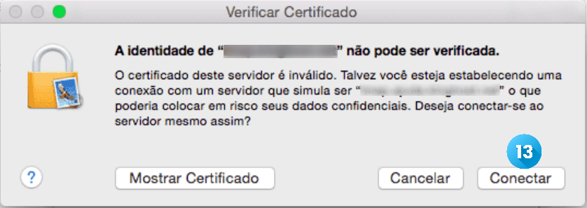 Se o Mail MAC exibir uma mensagem de que o certificado não pode ser verificado. Apenas clique em Conectar   13   para prosseguir na instalação.