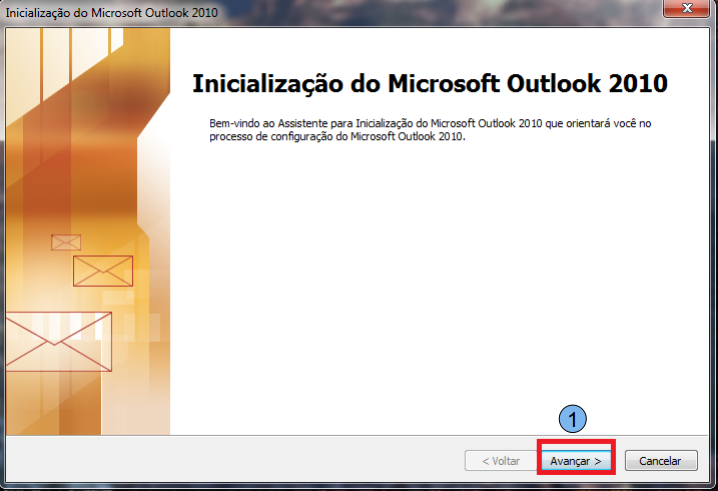 Ao iniciar o Outlook 2010, clique em Avançar (1) para iniciar a configuração de conta de e-mail.