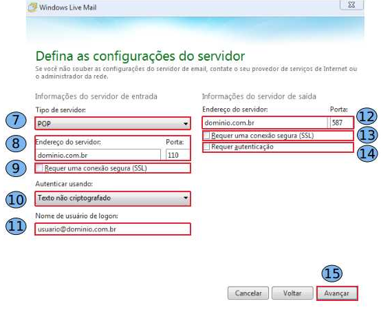 Adicione, agora, as configurações do seu servidor: Tipo de servidor: POP. (7) Endereço do servidor: dominio.com.br. (8) Porta: 110. (8) Desmarque a opção “ Requer uma conexão segura (SSL). (9) Autenticar usando: escolha a opção “Texto não criptografado”. (10) Nome do usuário de logon: informar a conta de e-mail completa “usuario@dominio.com.br” (11). “Endereço do servidor” (12): defina a porta “587”. Desabilite a opção “Requer uma conexão segura (SSL). (13) Habilite a opção “Requer autenticação” (14) Cliquei em “Avançar” (15).