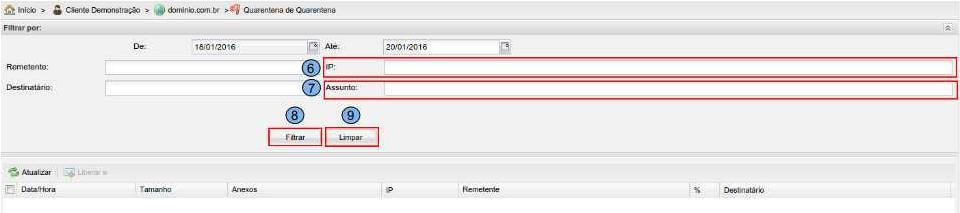 Guia “IP” (6) - informe o IP utilizado pela conta no momento do envio (Exemplo: 198.17.13.17). Guia “Assunto” (7) - adicione o assunto do e-mail (Exemplo: Nota Fiscal). Emfim, clique me “Filtrar” (8). Caso queira remover os dados inseridos no “Filtra por” clique em “Limpar” (9).