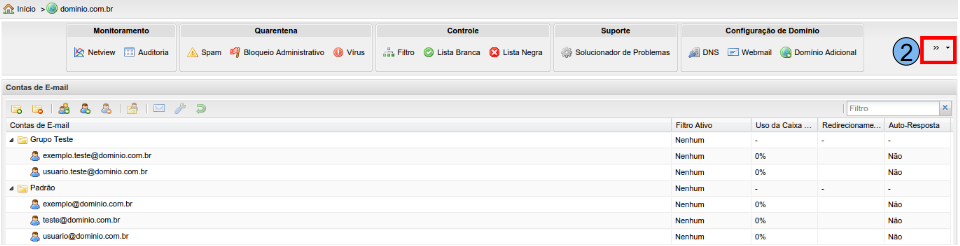 Para iniciar o processo de visualização do relatório de tráfego diário de e-mails, na tela inicial do Painel de Controle, localize o domínio desejado, neste caso, será utilizado “domínio.com.br” (1), clique duas vezes sobre o mesmo.
