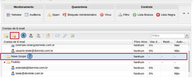 Na guia “Contas de E-mail” clique no ícone “Adicionar Grupo” (2).