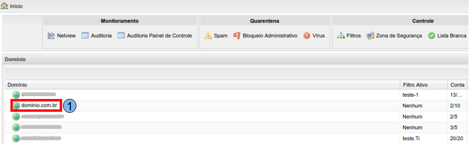 Para iniciar o processo de visualização do relatório de último acesso às caixas postais, na tela inicial do Painel de Controle, localize o domínio desejado, neste caso, será utilizado “domínio.com.br” (1), clique duas vezes sobre o mesmo.