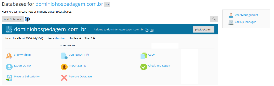 Na tela de administração de banco de dados temos as principais opções: (4) Add Database: Utilizado para realizar a criação de um novo banco de dados (5) phpMyAdmin: Utilizada para gerenciar o banco de dados já criado (6) Export Dump: Realiza a exportação do banco de dados (7) Import Dump: Utilizado para importar um backup (8) Remove Database: É utilizado para remover o banco de dados criado (9) User Management: É utilizado para remover ou alterar a senha do usuário do banco de dados (10) Backup Manager: Pode ser utilizado para gerar e gerenciar backup da base de dados